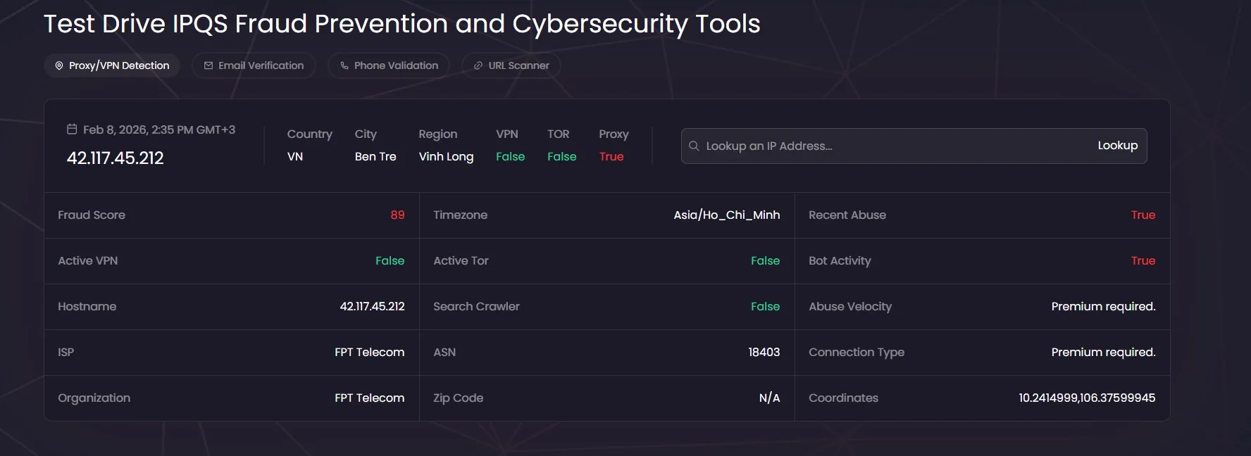 Anti-bot systems also use solutions for scoring IP addresses. For independent verification of IP quality, you can use third-party scoring services. One of the most popular options is IPQualityScore.