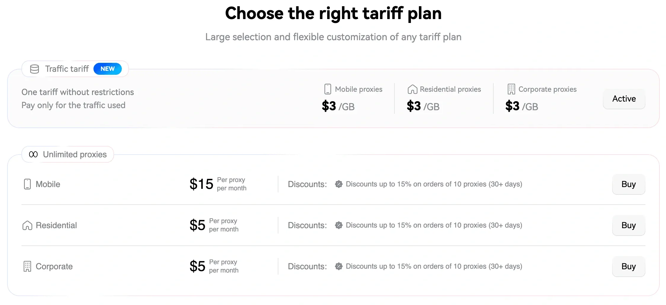 - Mobile Proxies. Sold for a period, either by the day or by the month, with unlimited traffic. Renting for 24 hours costs about $1.5–$3, and a full month of a high-quality mobile channel with rotation will cost $35–$60.