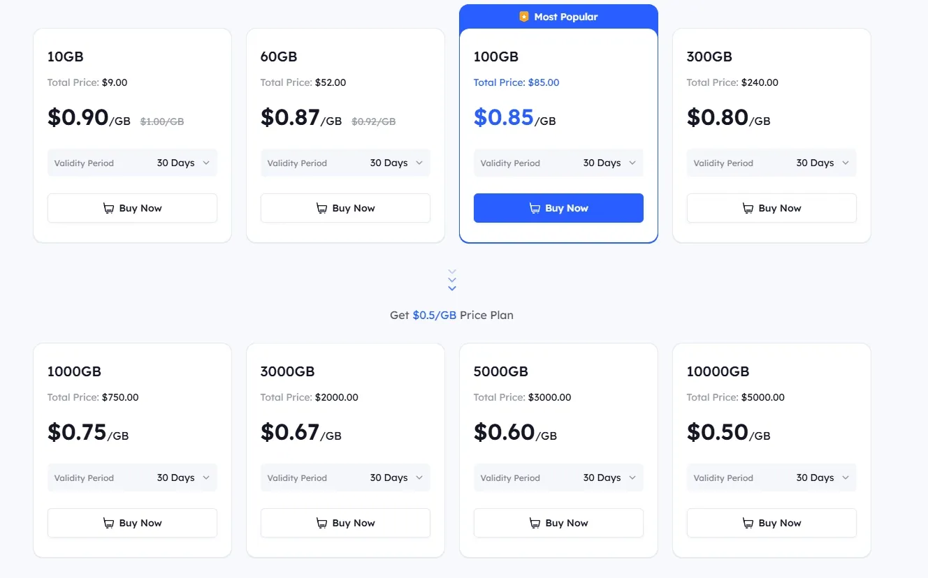 - Residential Proxies. Here, the pay-per-traffic model is most often used. The average price per 1 GB starts from $3 in budget services and can reach $15 with premium providers. The larger the volume of traffic purchased, the cheaper each gigabyte costs.