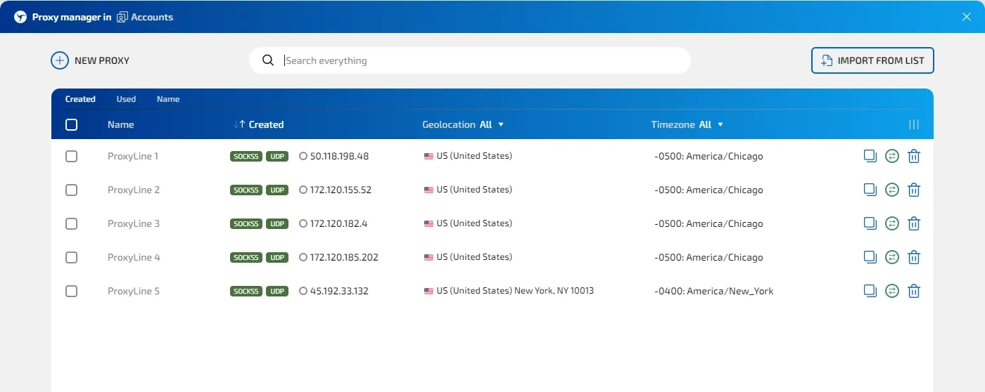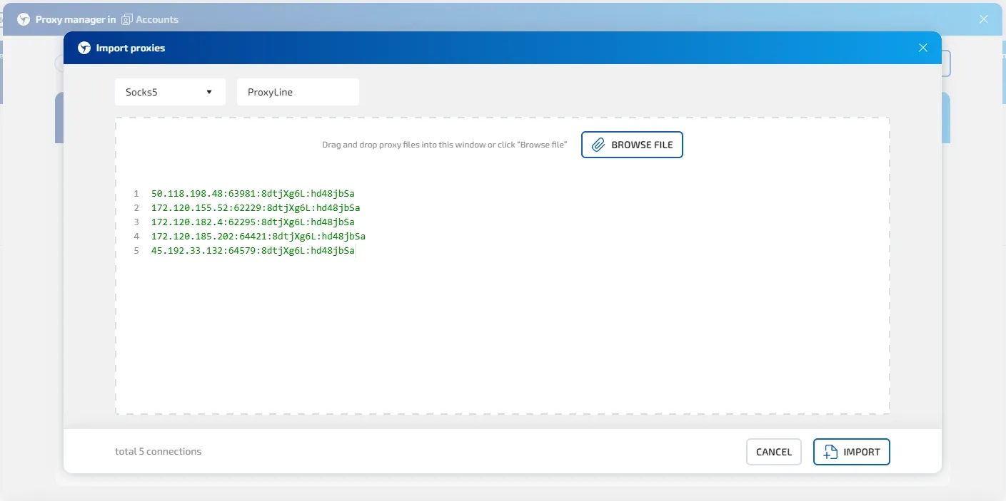 4. In Linken Sphere, you can add all proxies at once to the proxy manager by copying and pasting the data as a list (the browser will automatically recognize the IPs and assign a name to each), making it convenient to add proxies to existing profiles.