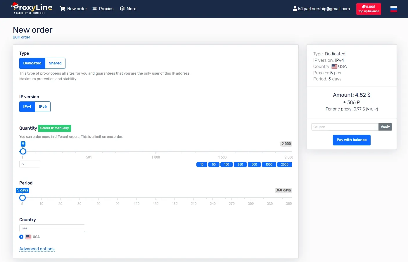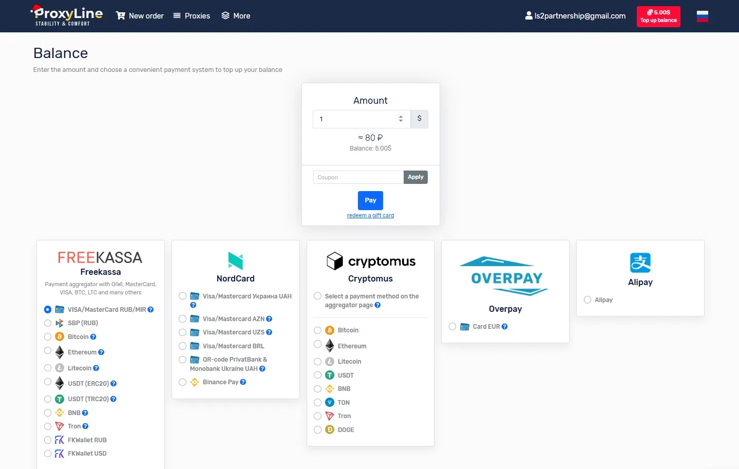 1. Registration and Balance Top-Up in ProxyLine. The service has no minimum deposit, and the minimum rental period for a proxy is 5 days, costing less than $1. You can pay for proxies using bank cards, cryptocurrency, and various payment systems.