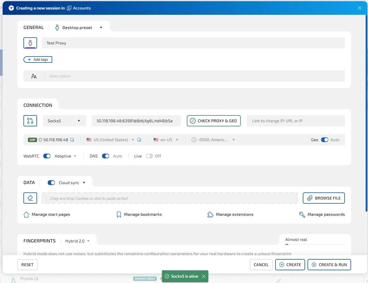 Alternatively, you can manually add proxies when creating a new session. Simply copy the data of the desired IP at the connection type selection stage and paste it into the corresponding field: