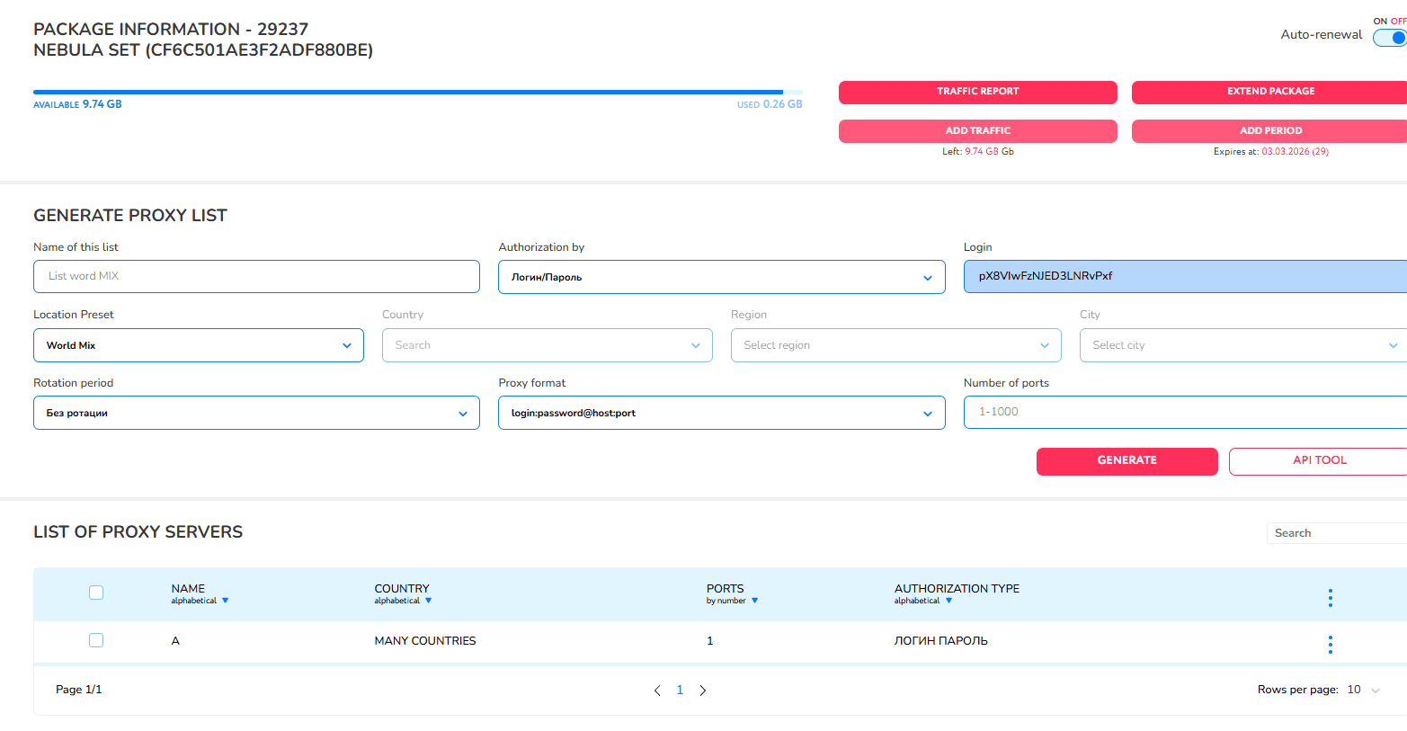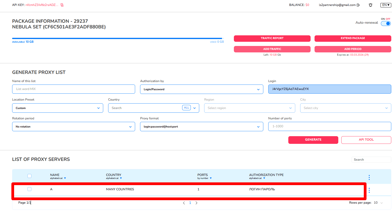 In the "Generate Proxy List" block, configure the proxies for our task. We leave "Login/Password" authorization. In "Location Preset", we selected a mix of different countries. We leave the format standard — login:password@host:port. In the "Number of ports" field, we specify 1, since we need one proxy. Click the "Generate" button. After that, the created proxy appeared below, in the "List of Proxy Servers" block.