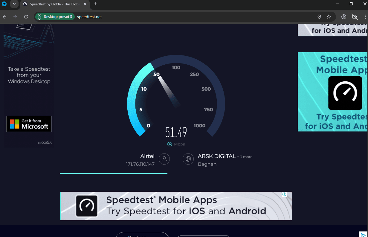 We additionally check the connection via Speedtest. In the same profile, we open the speedtest.net website and run a speed test.