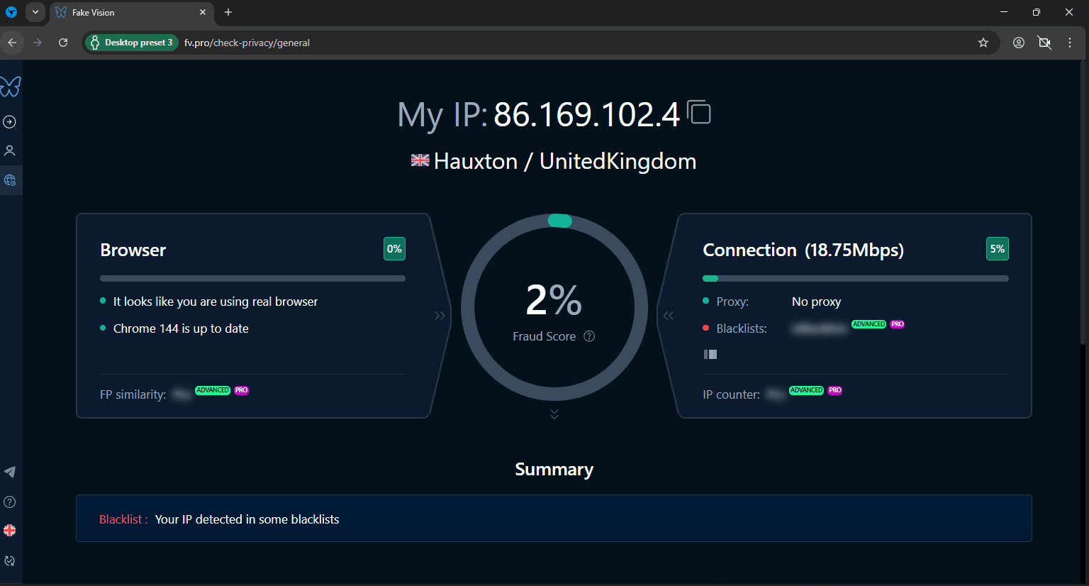 Proxies from Proxyma work perfectly with the Linken Sphere anti-detect browser. The connection really works through the issued IP. This is evident from the check on fv.pro: the service shows the IP, country, and city that correspond to the proxy. The Fraud Score is low, and the browser is detected as a normal, up-to-date version of Chrome without suspicious triggers. This means that the profile and proxy are linked correctly and technically everything works as it should. We recommend testing proxies from Proxyma, especially since the promo code LinkenSphere20 gives a 20% discount on the first purchase.
