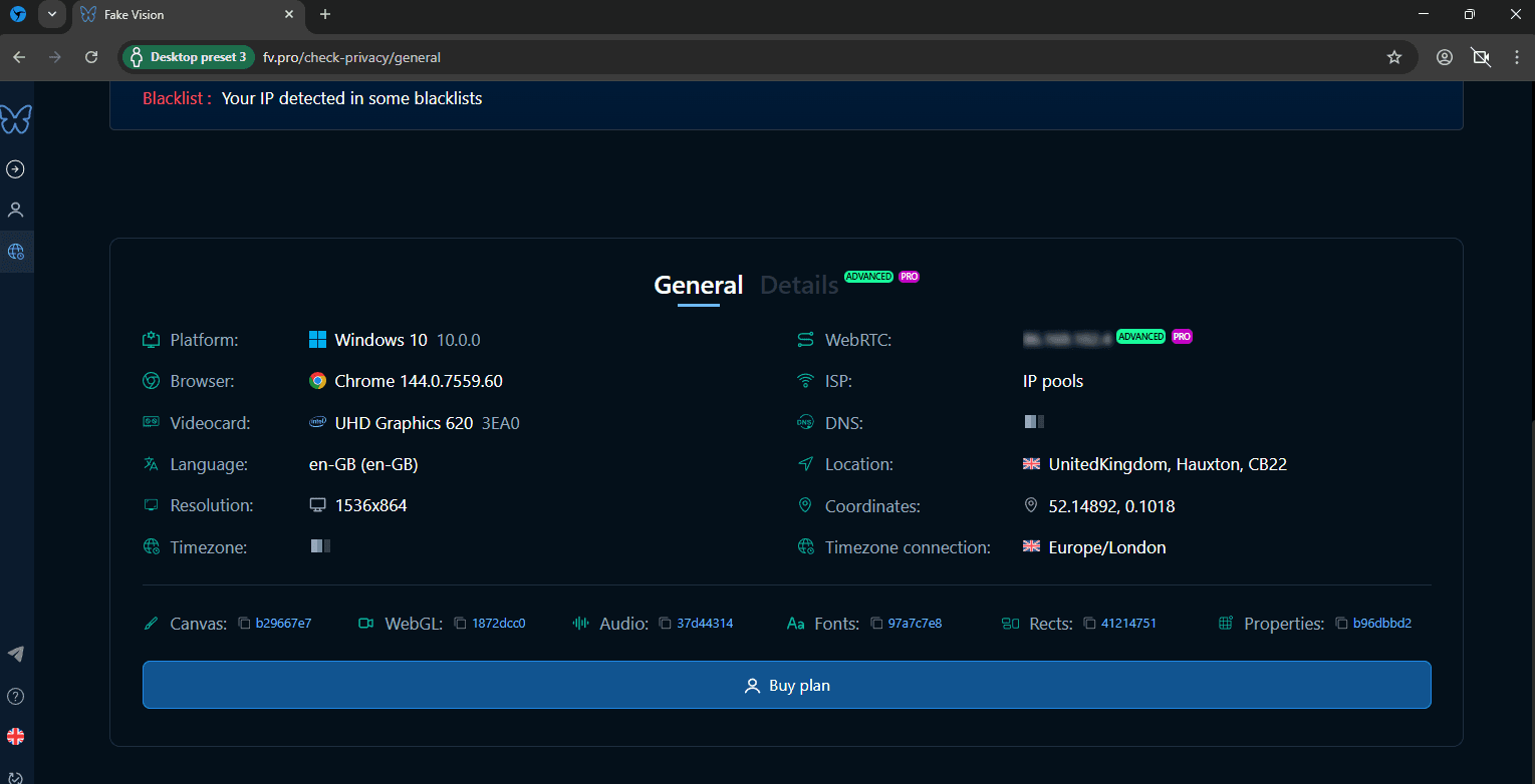 The Fraud Score is low, which means the profile does not look suspicious. In the "Browser" block, it can be seen that a real browser and the current version of Chrome are used, that is, everything looks normal in the browser part.