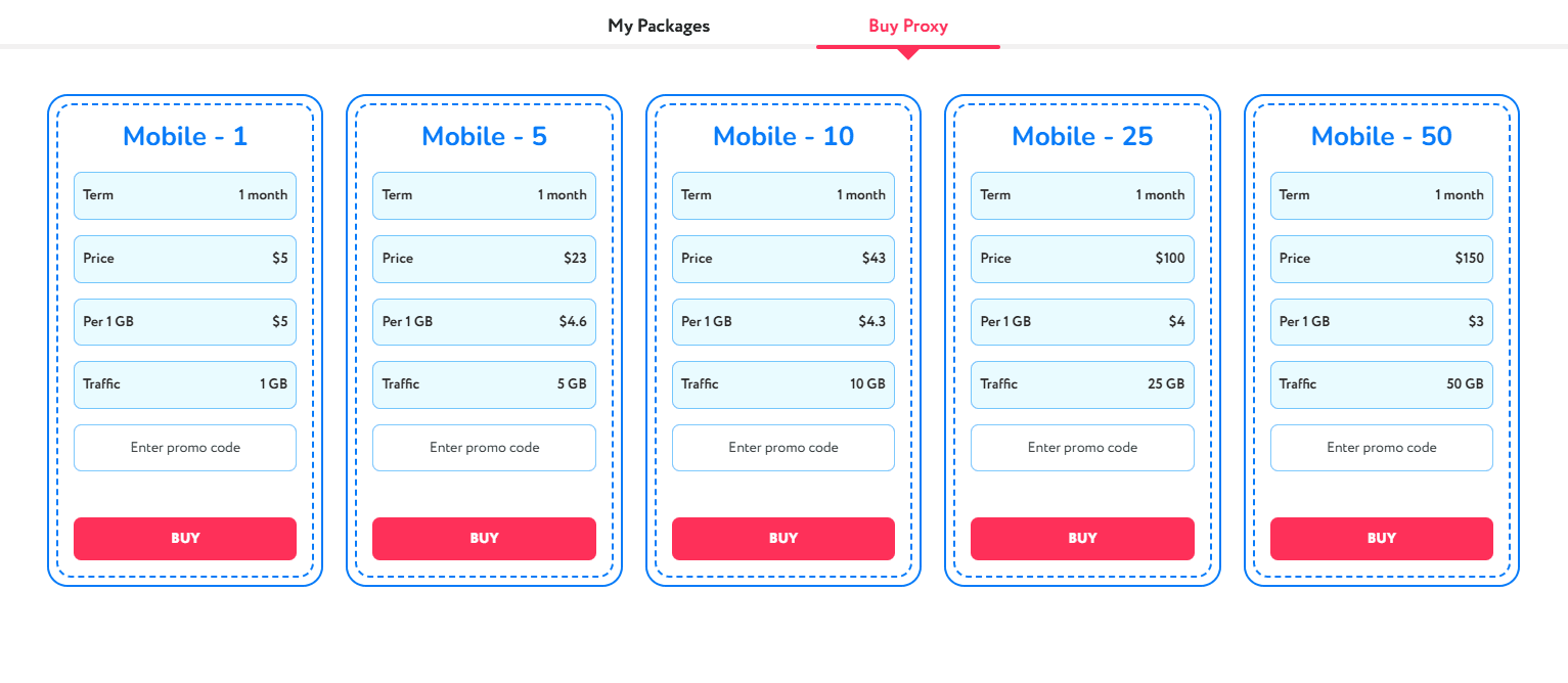 Mobile residential proxies are also sold in traffic packages for a period of 1 month. The following packages are available: