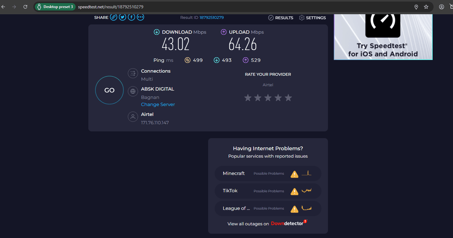 Soon, the system showed specific values for the connection via our proxy: the download speed is about 43 Mbit/s, the upload speed is 64 Mbit/s. These are normal working values for a residential IP, because the connection is not dead, without strong drawdowns, pages and services will open without problems. An unpleasant moment is that the ping is quite high.