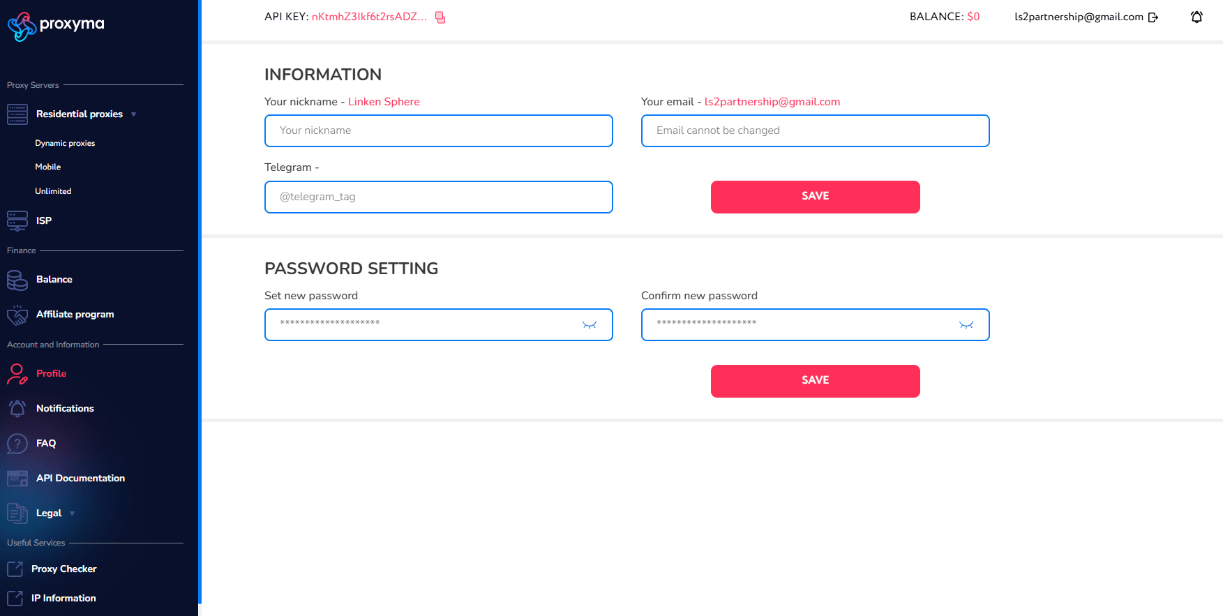 You can create an account by specifying a nickname, email address, and password, or you can authorize via Google. After that, you will enter the Proxyma personal account, through which all work with proxies is carried out.