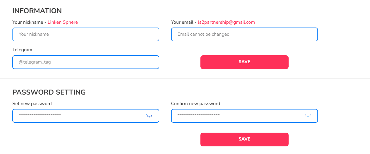 In the "Profile" section, you can change your nickname, add Telegram, set a new password, and get an API key for working with the service. This section is used to manage account data.
