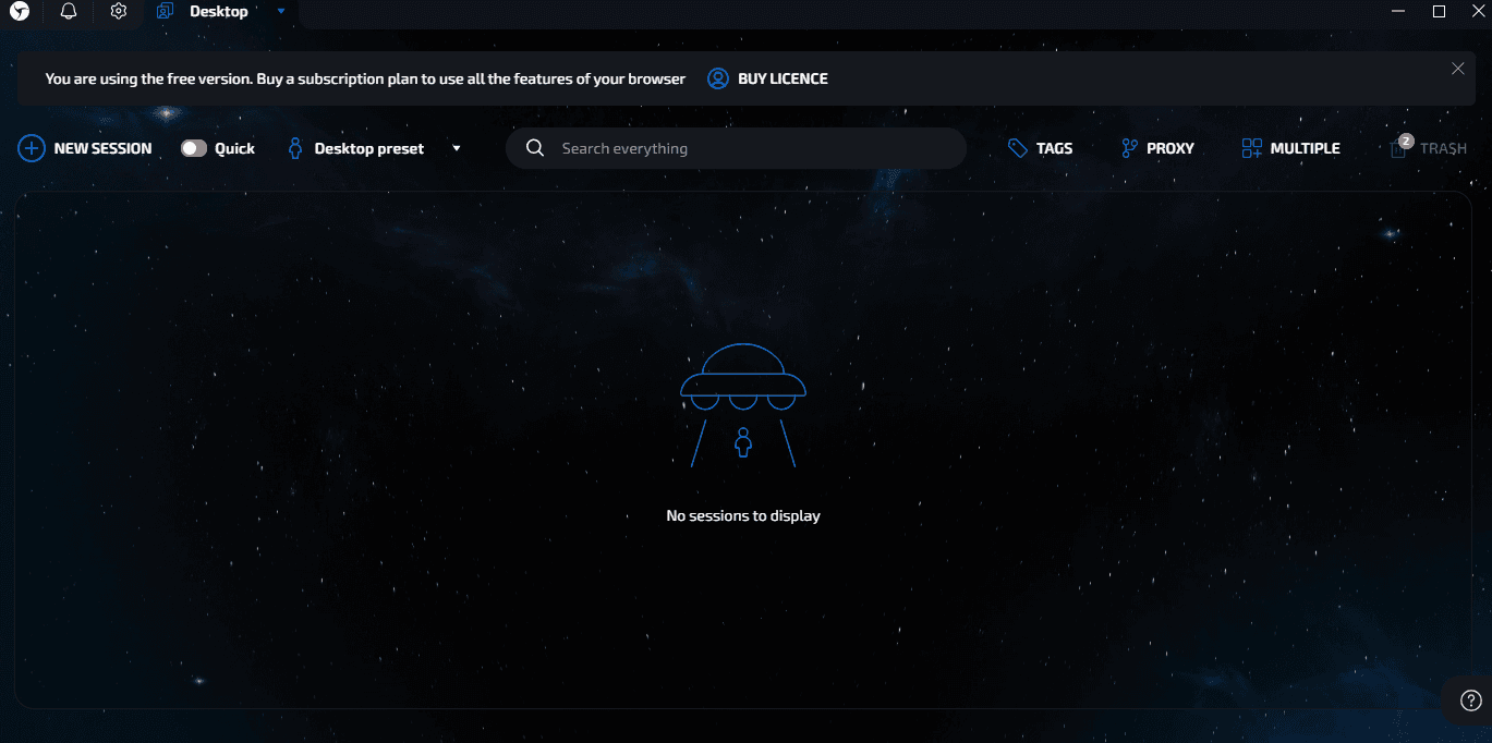 Now, in the Linken Sphere anti-detect browser, we create a new session. To do this, click the "NEW SESSION" button in the upper left part of the interface.