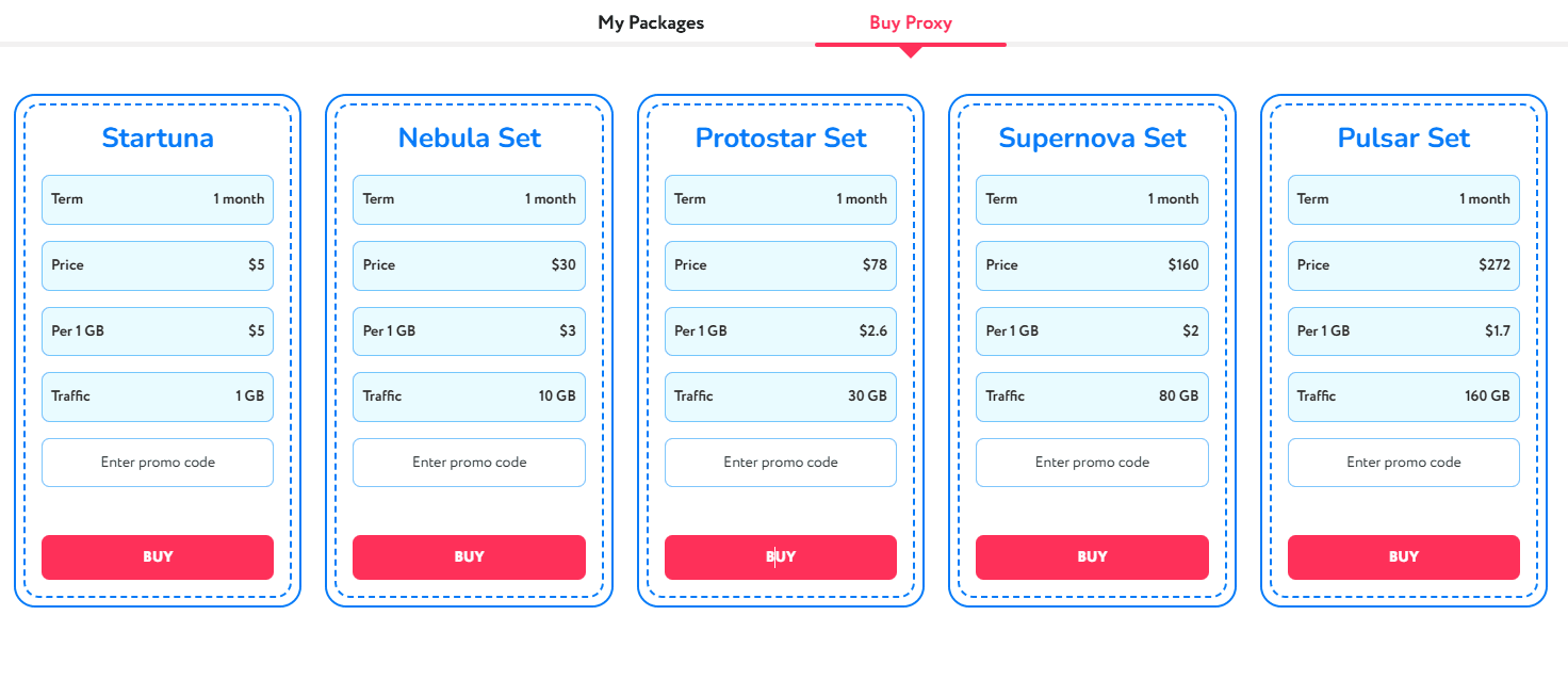 To proceed to the purchase, you need to open the "Buy Proxy" tab at the top of the page. This is where all tariff packages for the selected proxy type are located.