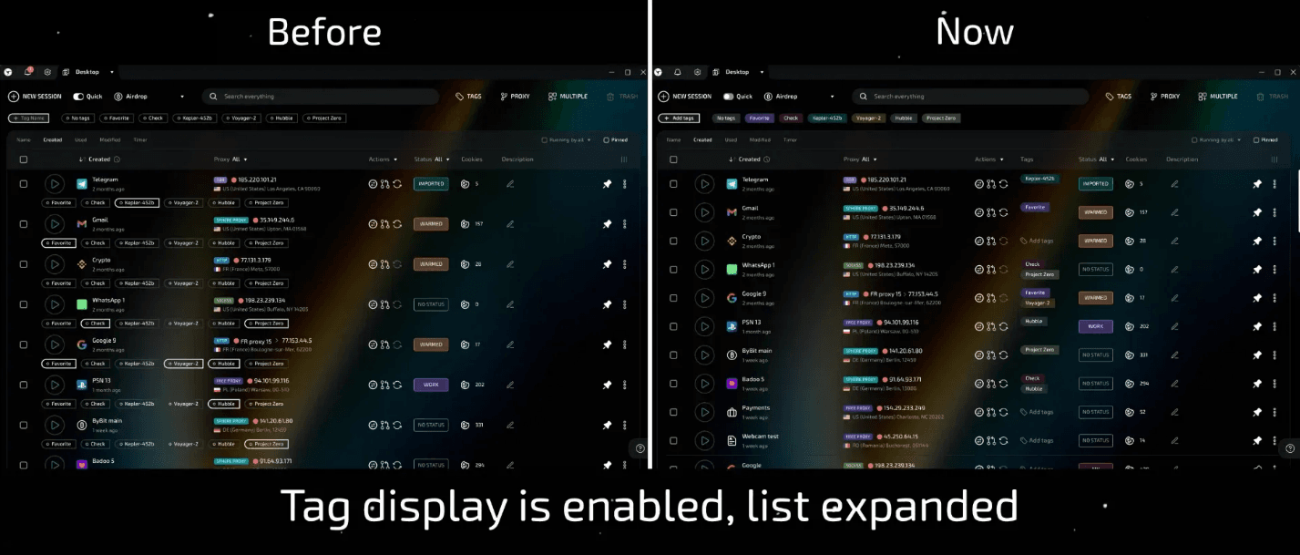 Tags have been moved to a separate column. This allows you to display more sessions on the screen and simplifies navigation. At the same time, tag management remains just as fast.