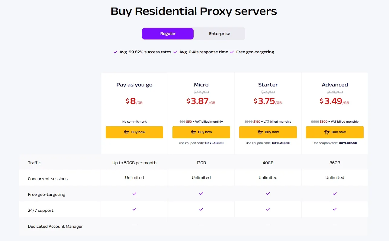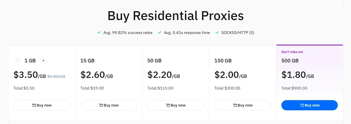- resident proxies with traffic billing at $8/GB, package formats with an average cost of $3.75 per GB