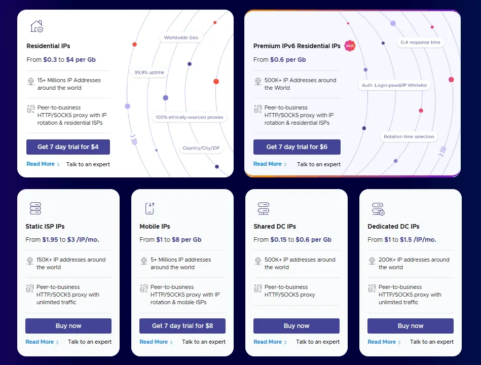 Proxy solutions for tasks of various levels. The company offers more than 20 million IP addresses, most of which are residential proxies, including both classic and premium IPs. In addition to residential proxies, there are static ISPs, dedicated and shared data center IPs, as well as mobile proxies.