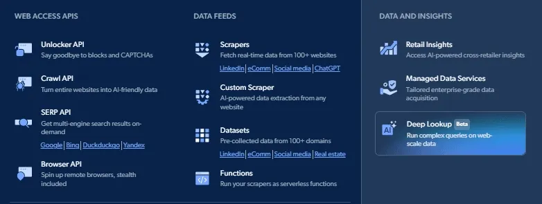 Additional features worth noting include Web Unlocker and Video Scraper API, which allow you to automate the process of collecting information from websites and YouTube.