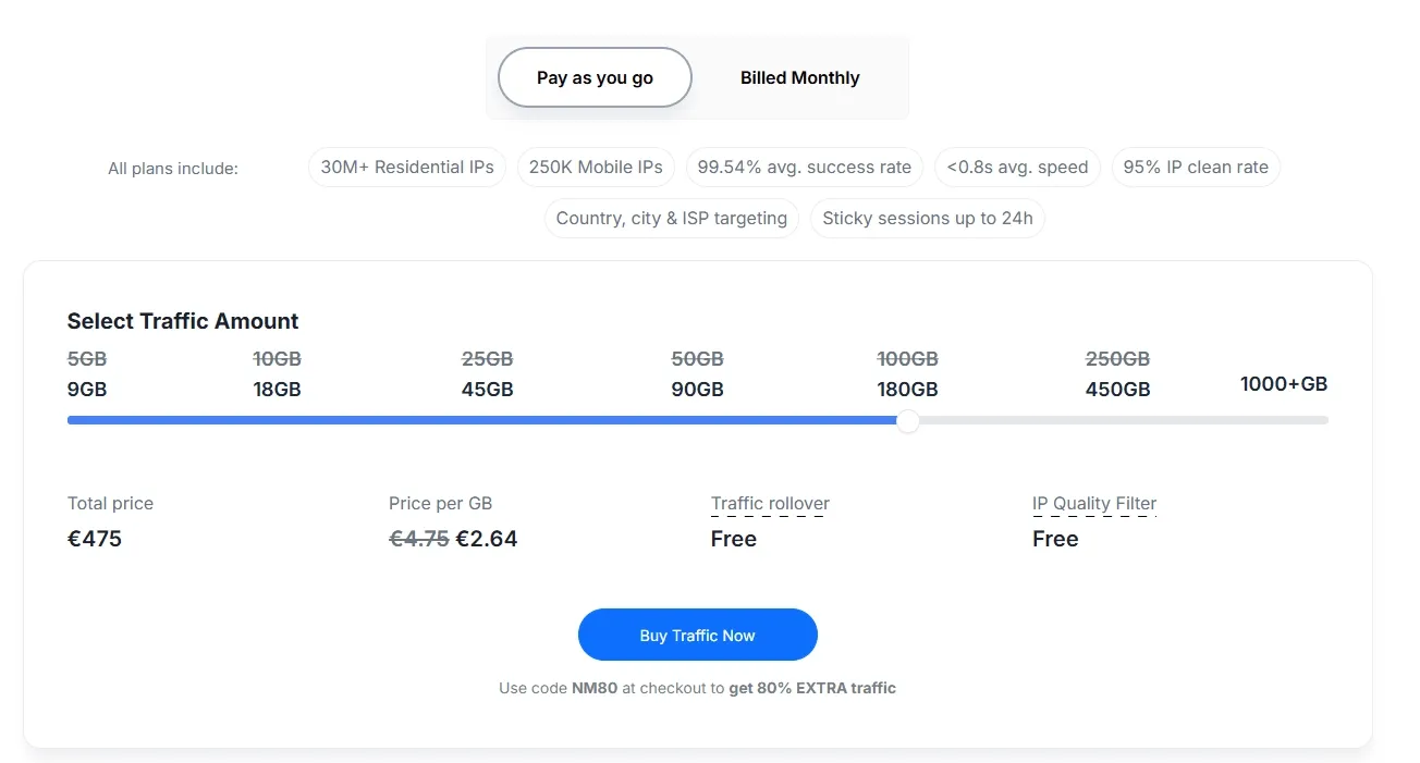 - mobile proxies at $5.4/GB with pay-per-traffic, as well as package formats with an average cost of $4.75 per GB