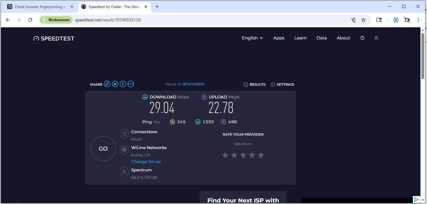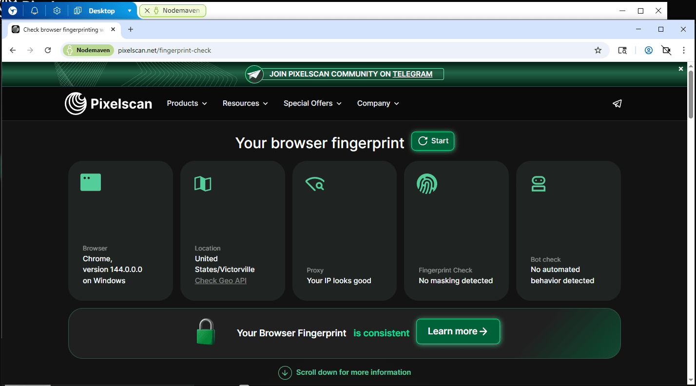 После сохранения сессии переходим к проверкам. Перед тестом скорости открываем FV.Pro или Pixelscan, чтобы убедиться, что конфигурация профиля и IP определяются корректно: протокол, DNS, WebRTC и fingerprint выглядят ровно.