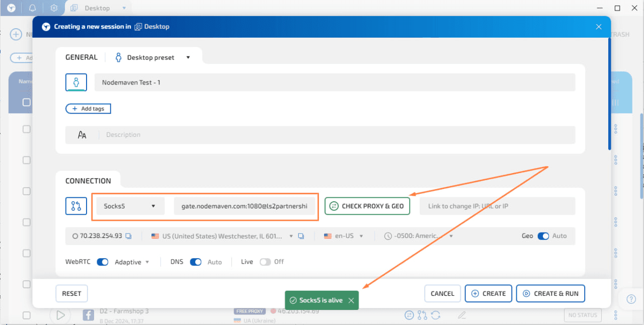 Теперь посмотрим, как прокси NodeMaven ведут себя в реальной сессии. Для теста мы берем резидентский статический IP США и создаем новый профиль в Linken Sphere.