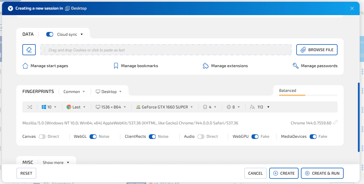 Выбери тип подмены отпечатков: стандартный – с возможностью выбора отпечатков вручную, гибридный – с автоматической настройкой профиля на основе данных вашего реального устройства, либо готовую конфигурацию из пула реальных устройств.